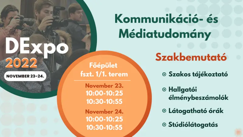 A Debreceni Egyetem idén november 23-24-én rendezi meg nagysikerű beiskolázási rendezvényét, a DExpót. Érdekel a média a világa, a marketing, a cégek kommunikációja, vagy az újságírás, esetleg a filmek? Szeretsz fotózni, szívesen kipróbálnád magad a kamera mögött? Ha válaszod igen, akkor mindenképp látogass el a Debreceni Egyetem Kommunikáció- és Médiatudományi Tanszékének programjaira.